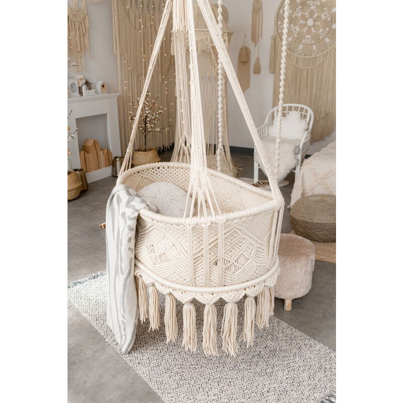 Create a safe and stylish haven for your little one with the beautifully handcrafted Macrame Baby Bassinet. Designed to bring warmth, comfort, and a touch of bohemian elegance to your nursery, this hanging cradle is the perfect blend of functionality and art.