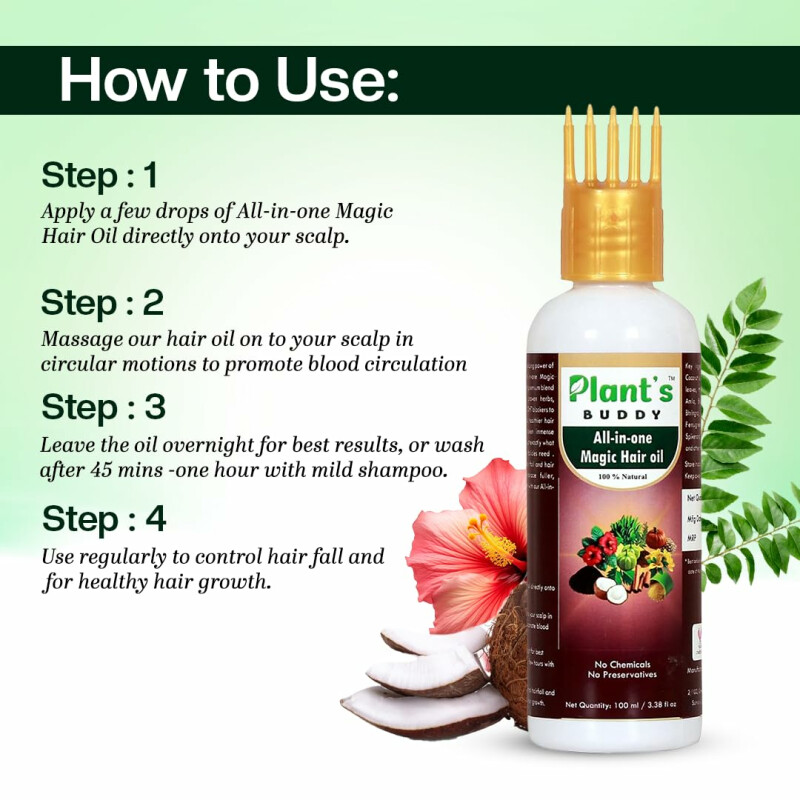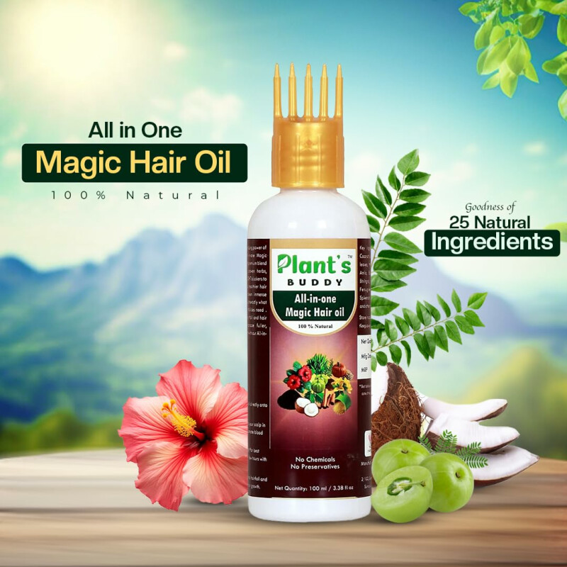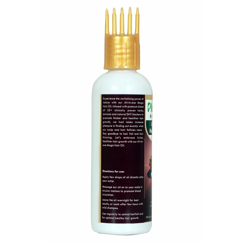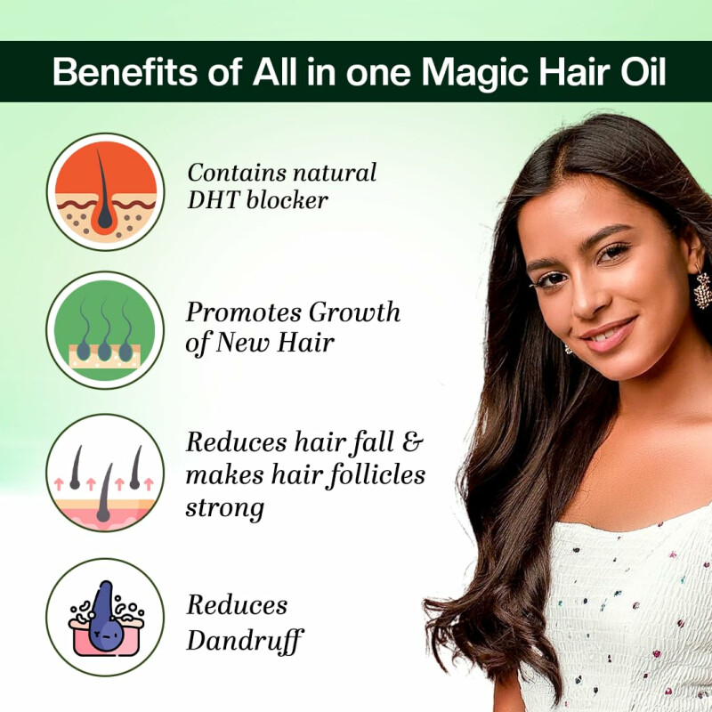 Dive into a world of botanical bliss with our exclusive blend of over 25 natural ingredients, meticulously selected to deliver unmatched results. Bid farewell to your hair woes with our All-in-One Magic Hair Oil. Enriched with the goodness of cold-pressed coconut oil, our formula penetrates deep into the hair shaft, replenishing moisture and fortifying each strand from within. Harnessing the power of natural DHT blockers, it combats hair loss and promotes optimal hair growth. From combating frizz to restoring shine, our herbal coconut hair oil is your ultimate solution for all your hair care needs.