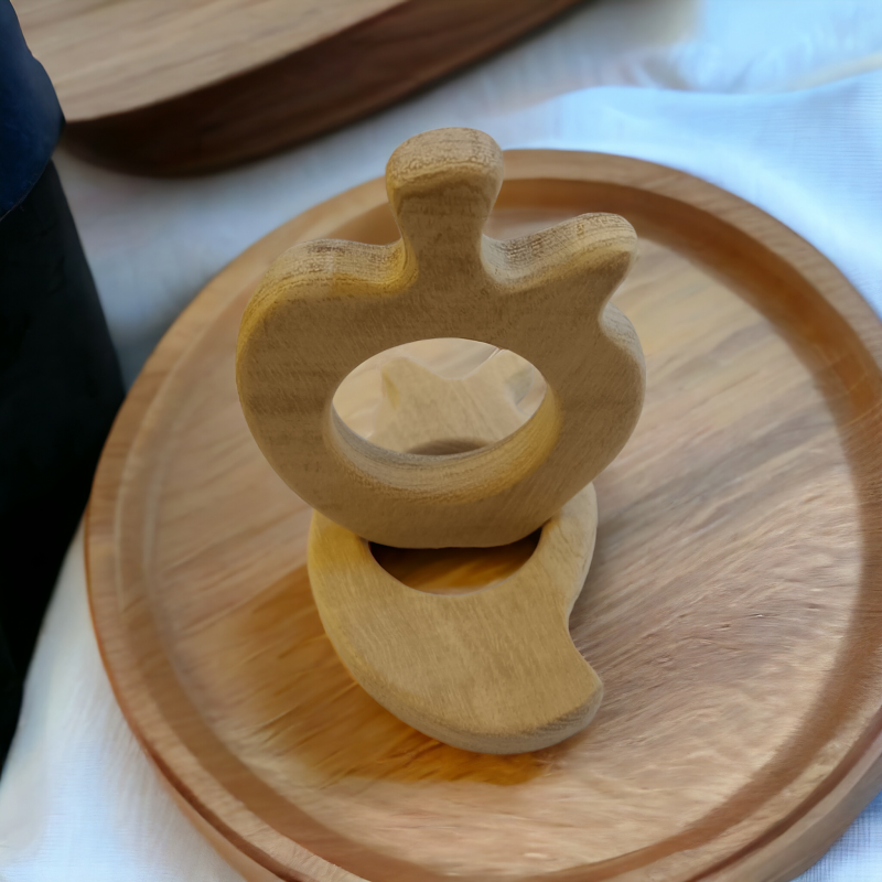Smooth, hand-polished edges prevent irritation while the lightweight design encourages grip development, hand-eye coordination, and sensory exploration. These teethers are perfect for Montessori-inspired play, daily use, or as a thoughtful eco-friendly gift for newborns. Give your baby a safe and natural way to explore, soothe, and develop fine motor skills with these charming neem wooden teethers.