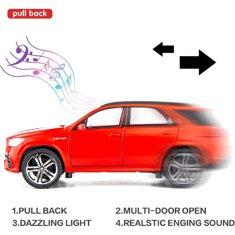 This die-cast car features openable front doors that trigger headlights and realistic engine sounds, giving kids an interactive playtime experience. The sound and light effects add excitement while enhancing sensory play. The car operates without batteries—just pull back and release, and watch it zoom forward effortlessly. The smooth pull-back mechanism is safe for young children and easy to operate.