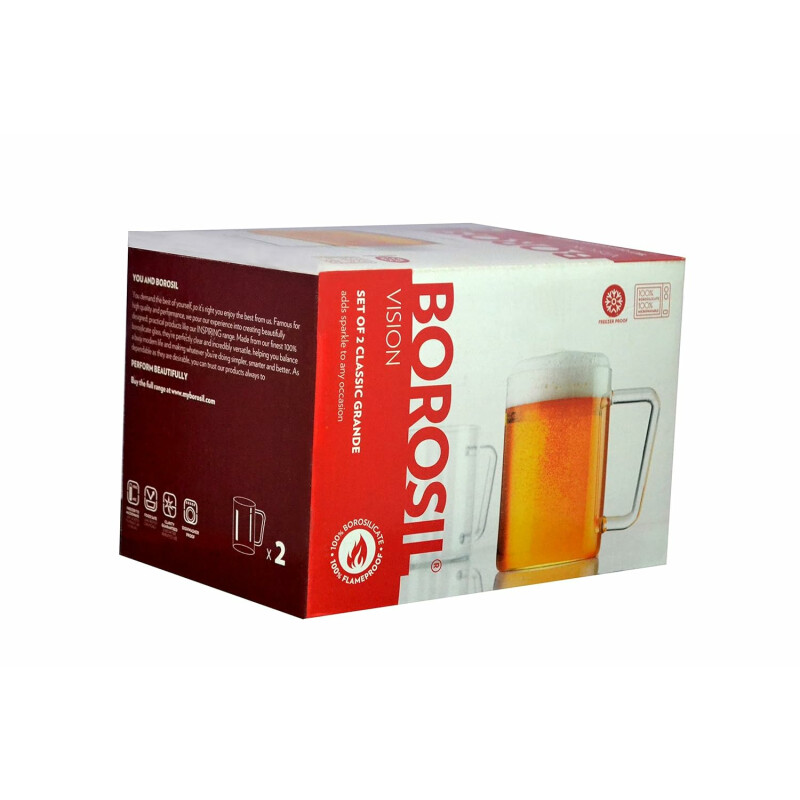 Enjoy your favorite drinks in style with the Borosil Classic Grande XL Mug/Beer Krüg (Set of 2, 500ml each). Made from 100% borosilicate glass, these mugs are designed to deliver unmatched durability, clarity, and convenience for everyday use. Perfect for beer, coffee, tea, or any chilled or hot beverage, these mugs are a versatile addition to your glassware collection.