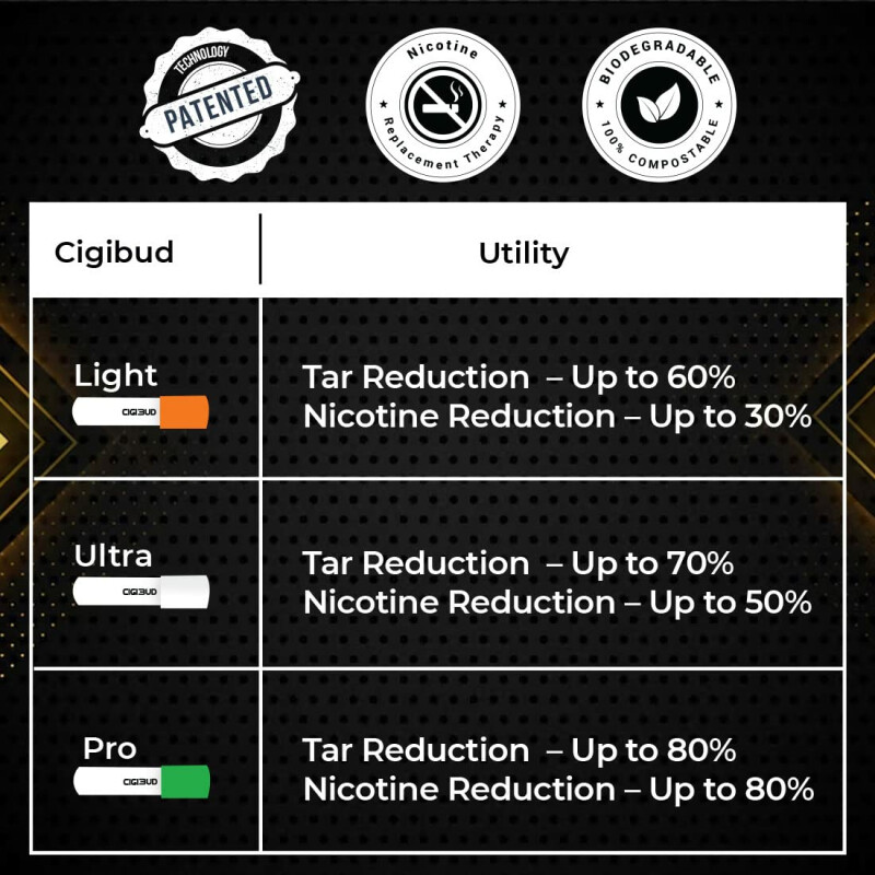 - Month #2: Cigibud Ultra cuts down toxic matter intake by upto 50%. The smoothness experienced is unlike any typical harsh inhale, training you towards a gentler experience.