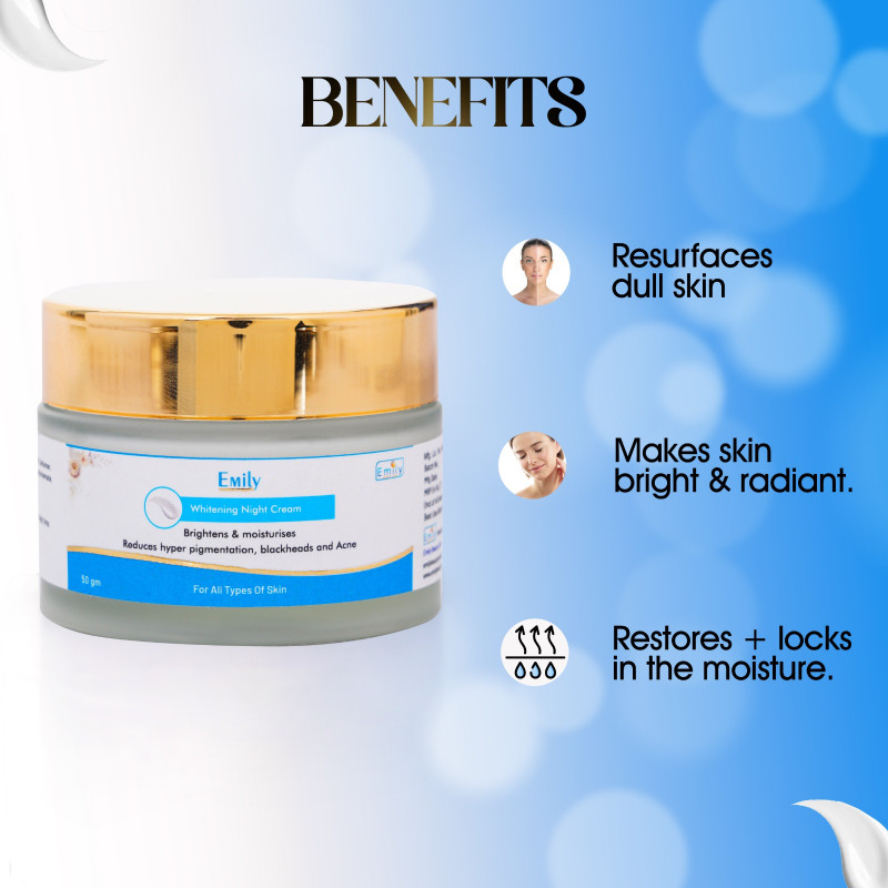 Emily Skin Whitening Cream isn't just about lightening your skin; it's about nourishing it from within. Hyaluronic acid and glycerin work together to deeply hydrate and moisturize your skin, leaving it soft, supple, and plump. Experience the luxurious texture as it melts into your skin, leaving behind a silky smooth finish.