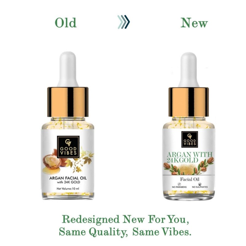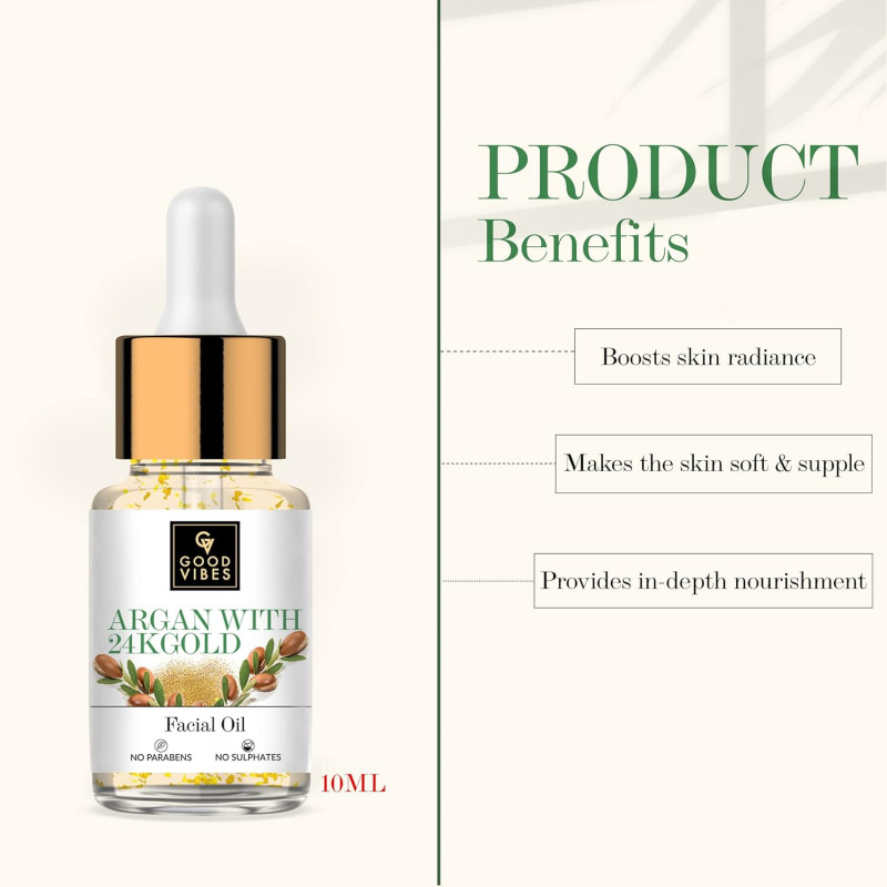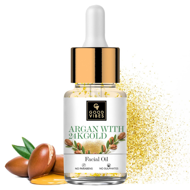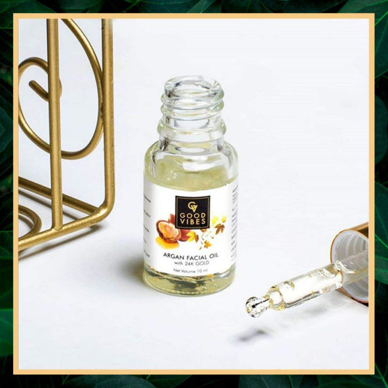 Good Vibes Argan With 24k Gold Facial Oil, 10 Ml | Boosts Collagen & Elasticity | Antioxidant Rich Glowing Skin With Anti Aging Properties For All Skin Types, No Parabens & Sulphates