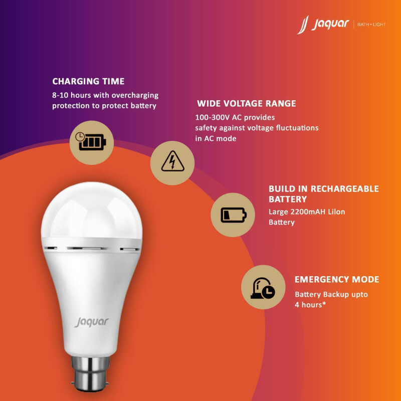 Jaquar Kriza B22d Led Emergency Bulb | Wide Voltage Range | 4 Hours Battery Backup | Automatic Rechargeable Led Bulb - 9w (cool White)