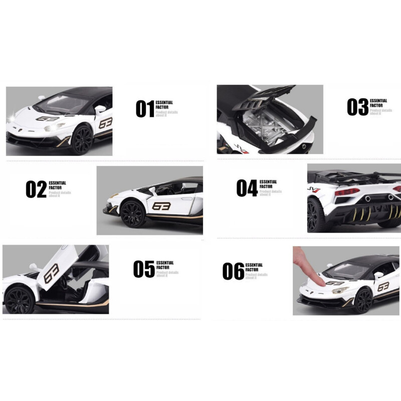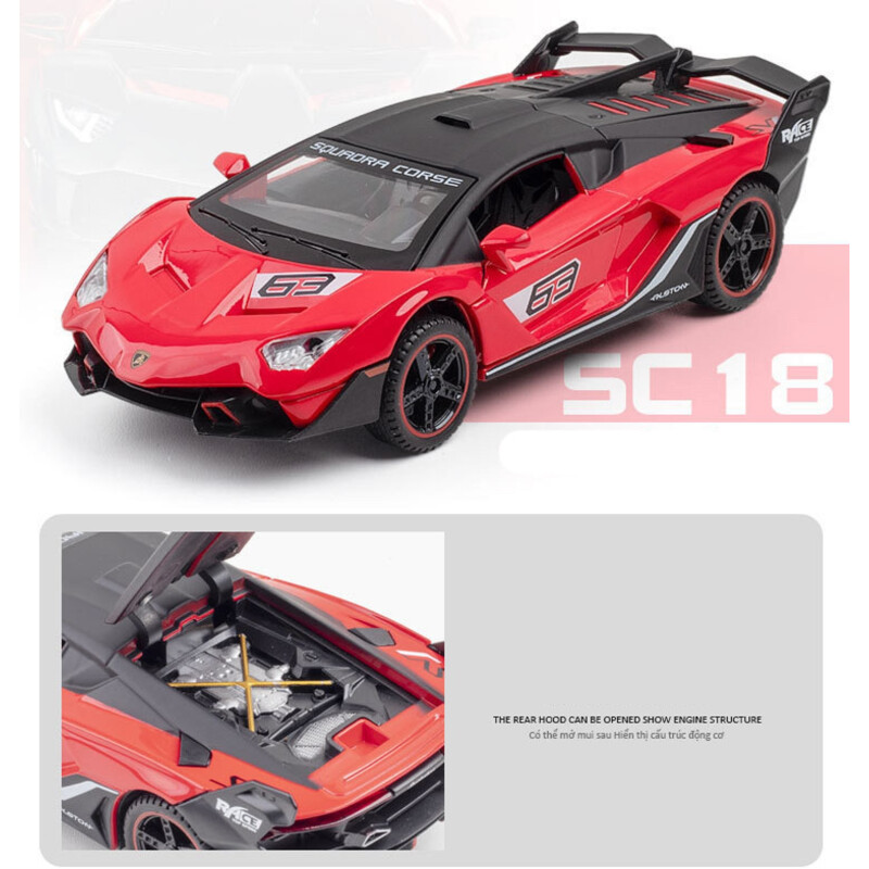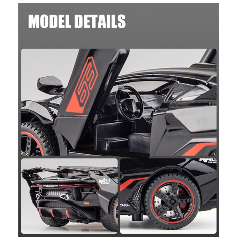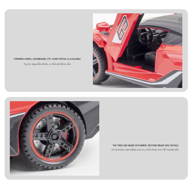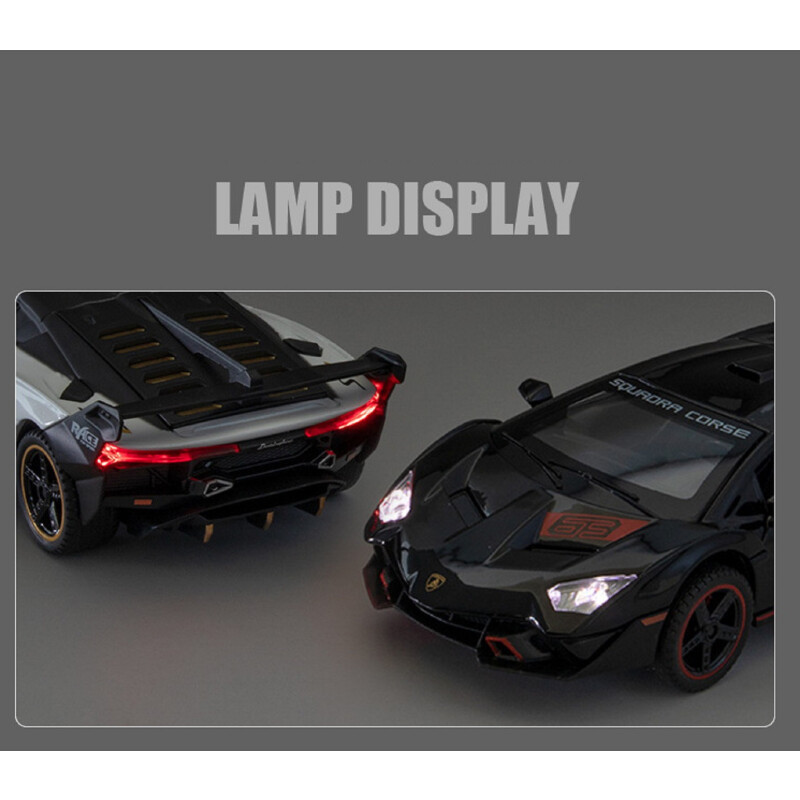Made from premium alloy metal and durable ABS plastic parts, this model car features realistic curves, high-gloss paintwork, and durable wheels. Both the doors and the hood can be opened, revealing intricate interior details. Kids will love interacting with the car’s push-activated engine sounds and bright LED headlights and taillights, which light up just like a real supercar.