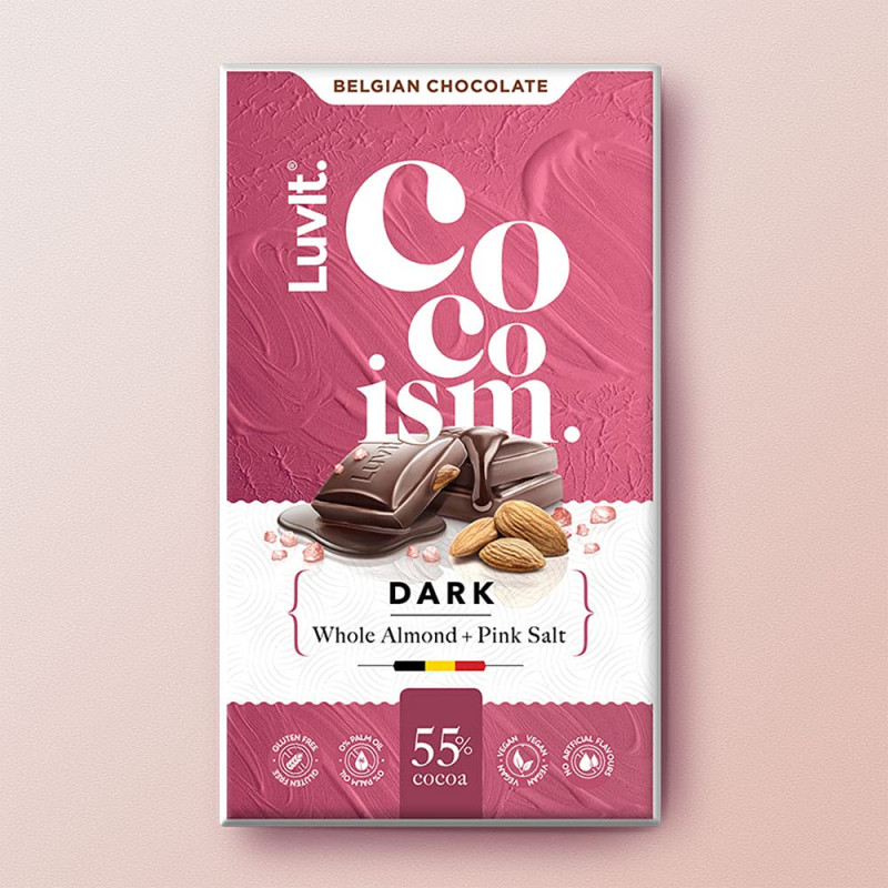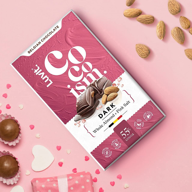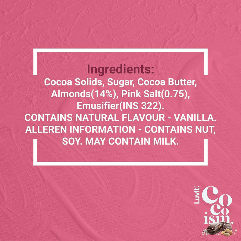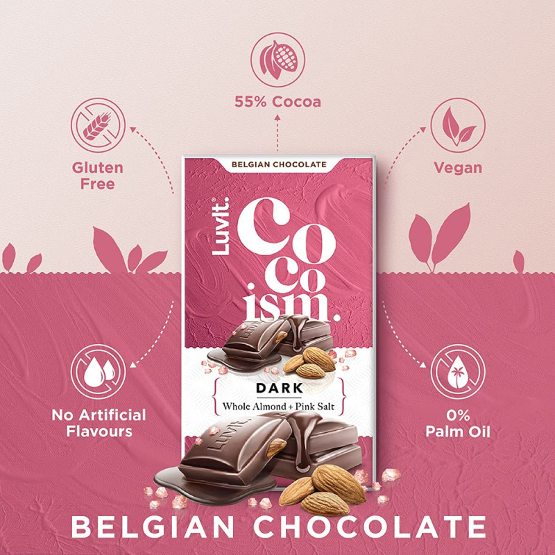 Luvit Cocoism Belgian Chocolates | 55% Dark Cocoa With Roasted Almond & Pink Salt | Decadent, Intense, Rich | Vegan | Gluten Free | Pack Of 1 - 90 Gm Bar