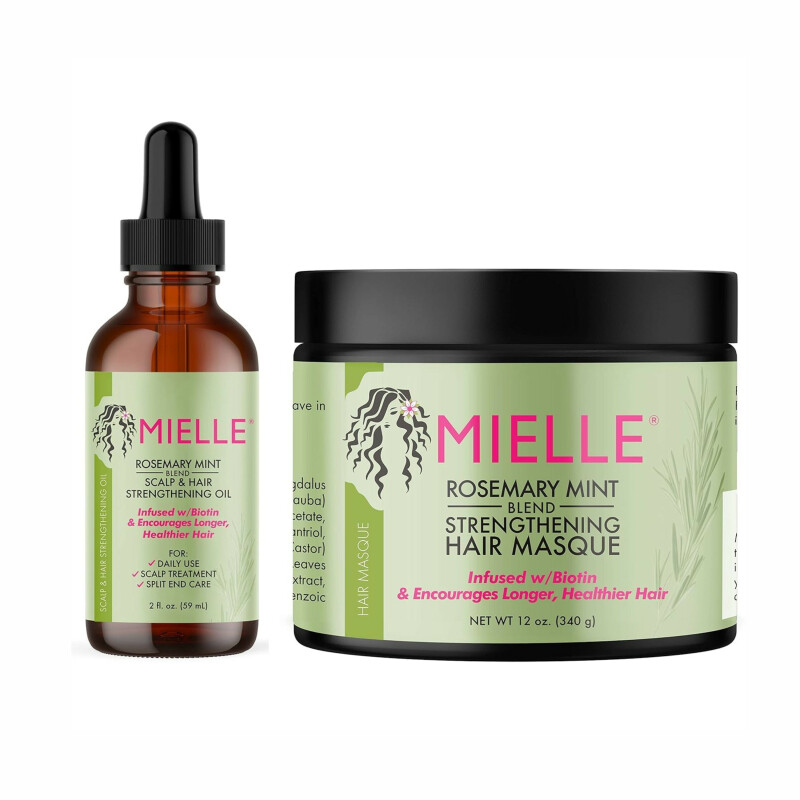 Transform your hair care routine with the Mielle Rosemary Mint Hair Care Bundle, a powerful combination of Mielle Rosemary Mint Scalp & Hair Strengthening Oil (59 ml) and Mielle Rosemary Mint Strengthening Hair Masque (340 g). Formulated with the natural goodness of rosemary, mint, biotin, and essential oils, this duo nourishes the scalp, repairs damaged hair, and boosts growth from root to tip.Whether you struggle with dryness, breakage, frizz, dandruff, or hair thinning, this bundle provides a complete solution. The oil stimulates blood circulation to encourage hair growth, while the deep-conditioning masque restores moisture, smoothness, and shine—making your hair soft, strong, and beautifully manageable.