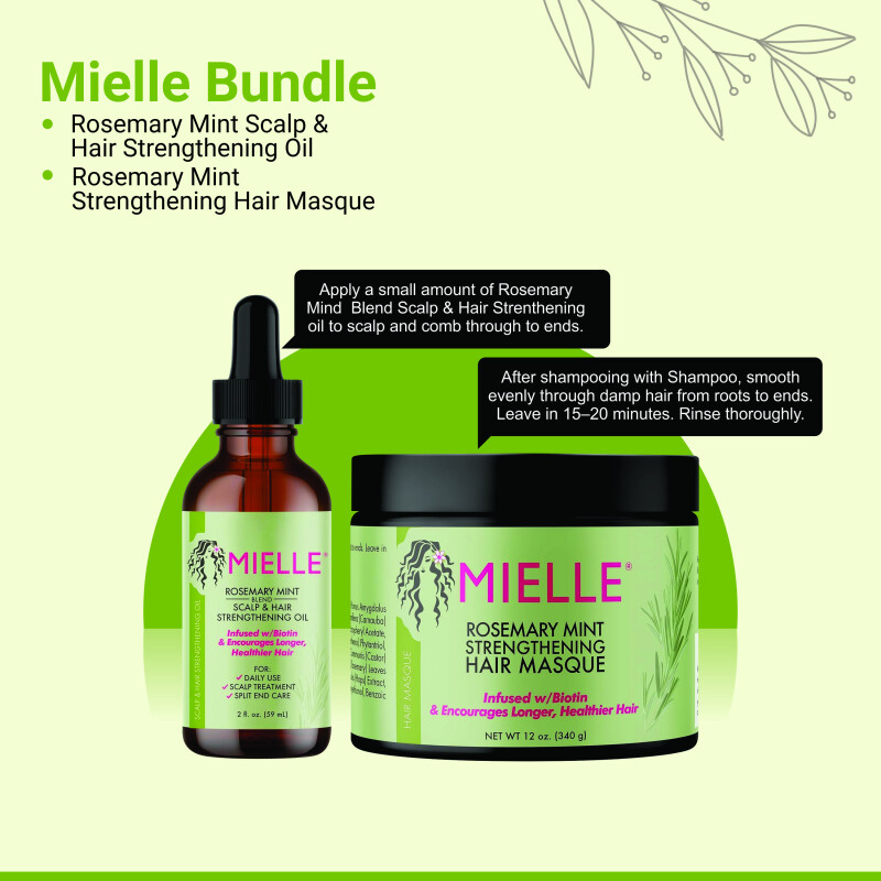 Mielle Bundle Rosemary Mint Scalp & Hair Strengthening Oil & Hair Masque – Complete Hair Care Solution Healthy, strong, and beautifully nourished hair begins with the right care. The Mielle Bundle Rosemary Mint Scalp & Hair Strengthening Oil 59 ML and Rosemary Mint Strengthening Hair Masque 340 Gram are the ultimate duo for hair revitalization. Designed to target weak, brittle, and dry hair, this bundle combines the power of natural ingredients with modern hair care technology.