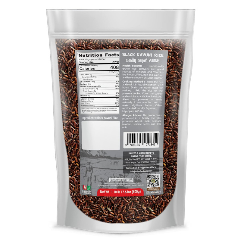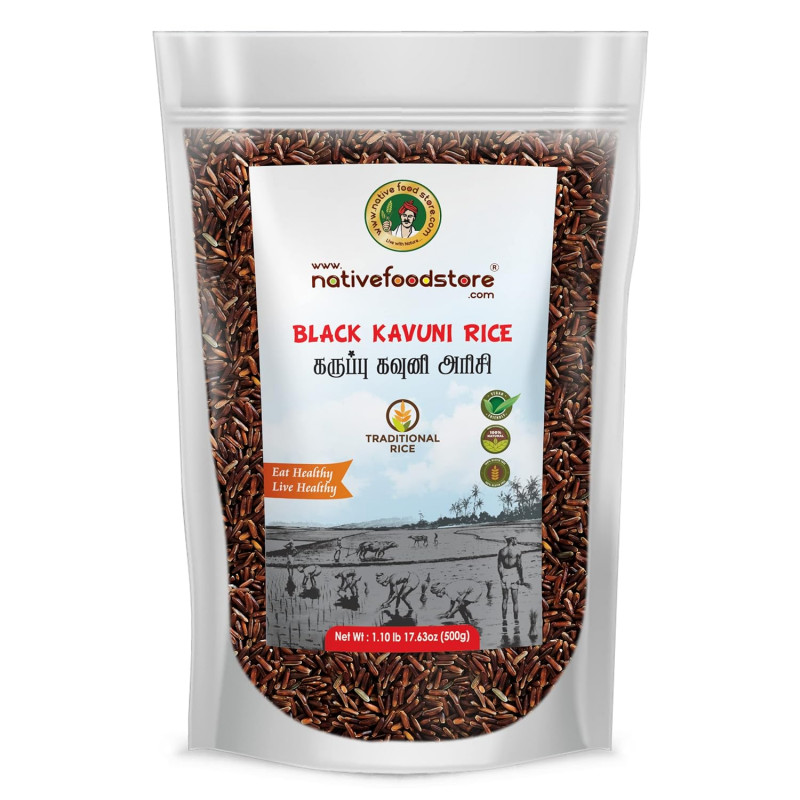 Black rice, also known as "kavuni arisi" is grown in the southern part of India and is one of the most nutritious varieties of rice. There are many health benefits associated with the regular consumption of black rice. This Black Kavuni Rice is a healthy alternative for the regular rice and thereby offers a nutritious meal. The rich content of protein and iron along with essential vitamins makes this rice a delicious choice. Black rice has a deep black colour and usually turns deep purple when cooked. The grain has a similar amount of fibre to brown rice and, like brown rice, has a mild, nutty taste. Despite being less popular than other rice varieties, research shows that black rice has the highest overall antioxidant capacity and activity. Therefore, adding black rice to your diet can be an easy way to incorporate more disease-protecting antioxidants into your diet. Cooking black rice is easy and similar to cooking other forms of rice. It is very useful and easy for the preparation of Dosa, Idly and Puttu. Use Black Kavuni rice in your daily diet with Nativefoodstore Karuppu Black Rice.
