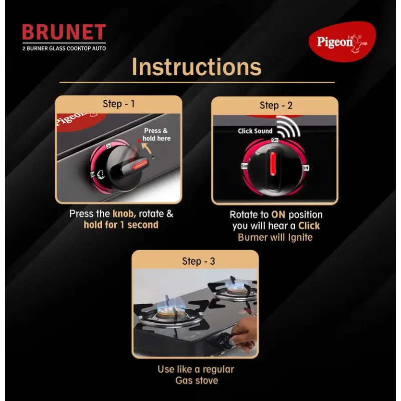 This gas stove also features unique pan supports that provide better stability for vessels, along with sturdy tubular legs for a strong grip on any surface. The unbreakable ABS knobs allow smooth and safe operation, while the fastener-free spill tray ensures easy cleaning after every meal. Designed with a service-friendly assembly, the Pigeon GT 2B Gas Stove is not only functional but also convenient for long-term use. Whether you are preparing quick meals or full-course dishes, this stove is the perfect balance of durability, efficiency, and style.