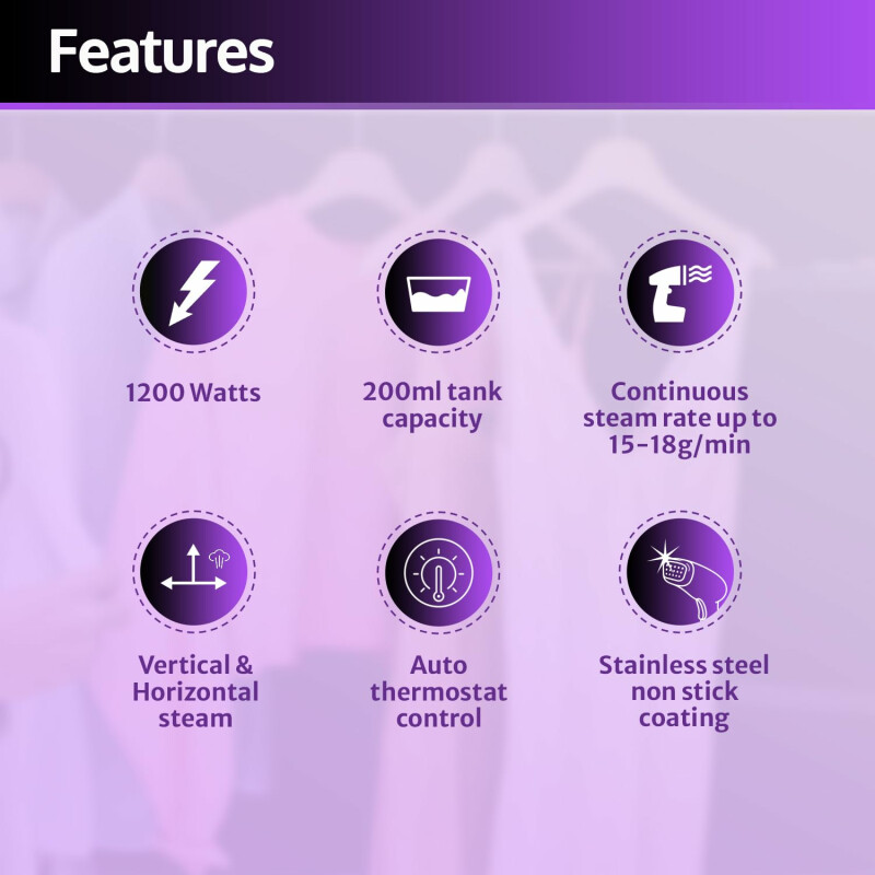 Make your ironing routine quicker and smarter with the Pigeon by Stovekraft Handheld Garment Steamer. Designed for convenience and efficiency, this garment steamer delivers powerful 1200 watts of performance, producing up to 15–18g/min of continuous steam. With its 200ml water tank, you can steam multiple clothes in one go without frequent refills.