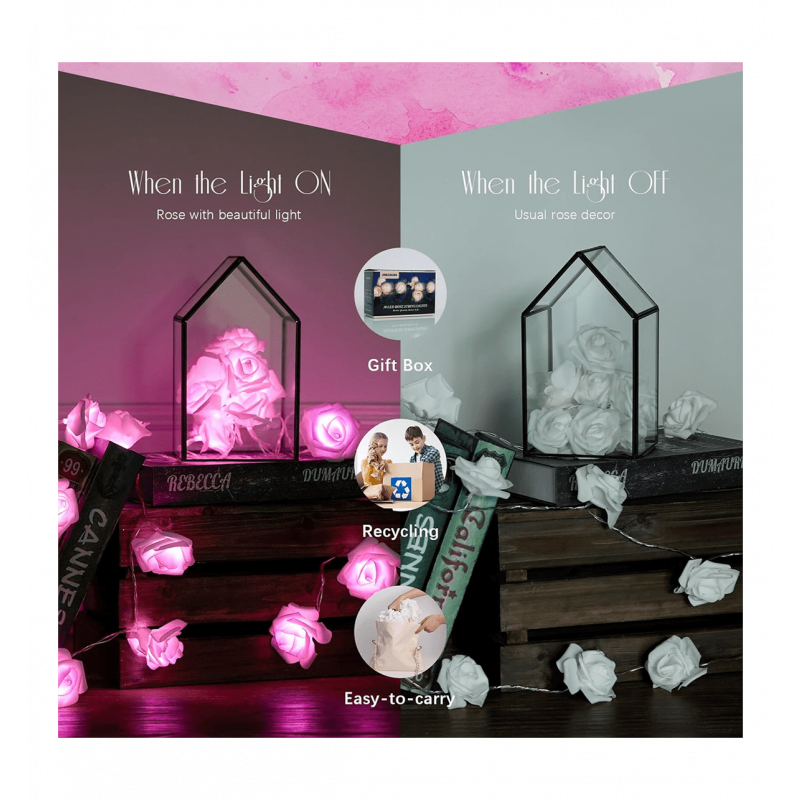 Each rose is illuminated with a gentle pink light, casting a romantic hue that captivates the heart and ignites the senses. Whether draped across a mantel, wound around a bed frame, or hung from ceiling hooks, these string lights add a touch of elegance and romance to any room.
