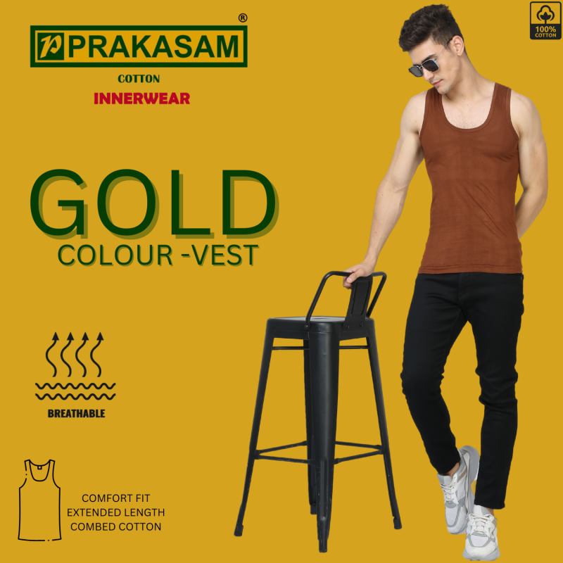 With a variety of colors in each pack, including classic shades and vibrant hues, these vests cater to different preferences and outfit styles. The durable stitching and high-quality fabric ensure long-lasting wear and easy maintenance. Whether you're lounging at home, hitting the gym, or layering under shirts for added warmth, these vests are versatile essentials for every man's wardrobe. Stay comfortable and stylish with the Prakasam Cotton Gold Men's Combed Cotton Round Neck Sleeveless Vest pack, offering quality, variety, and functionality in one convenient package.