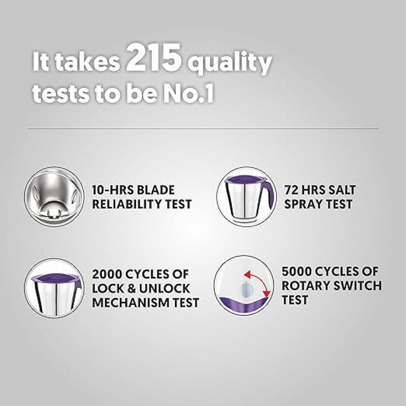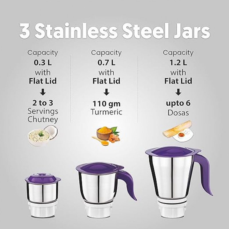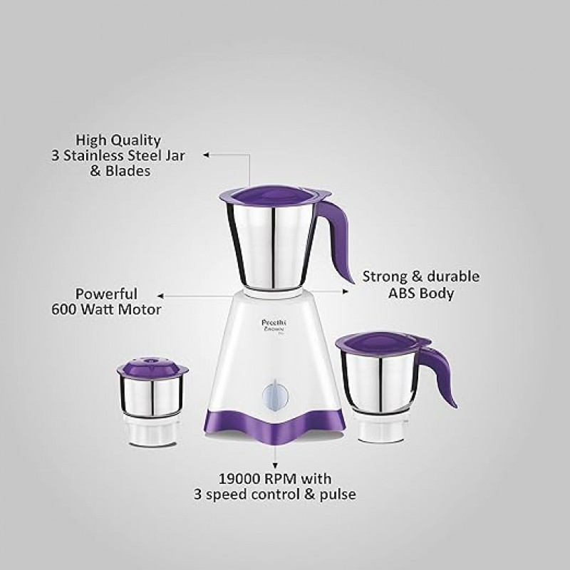 Preethi Crown Pro Mg-254 Mixer Grinder | 600 Watt | 3 Jars With 5yr Motor Warranty & Lifelong Free Service - White & Purple