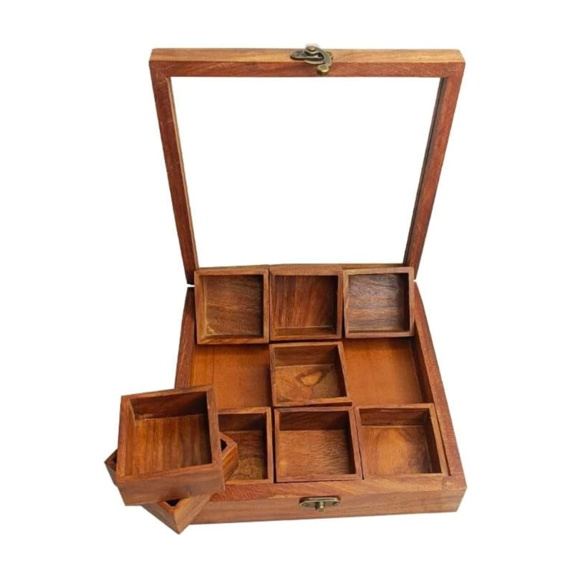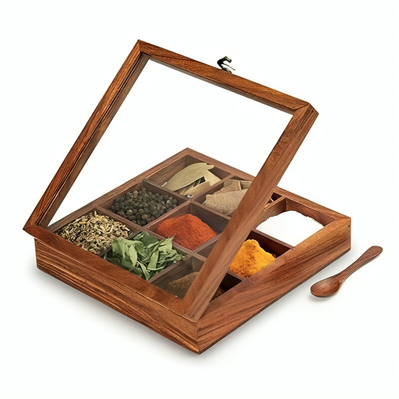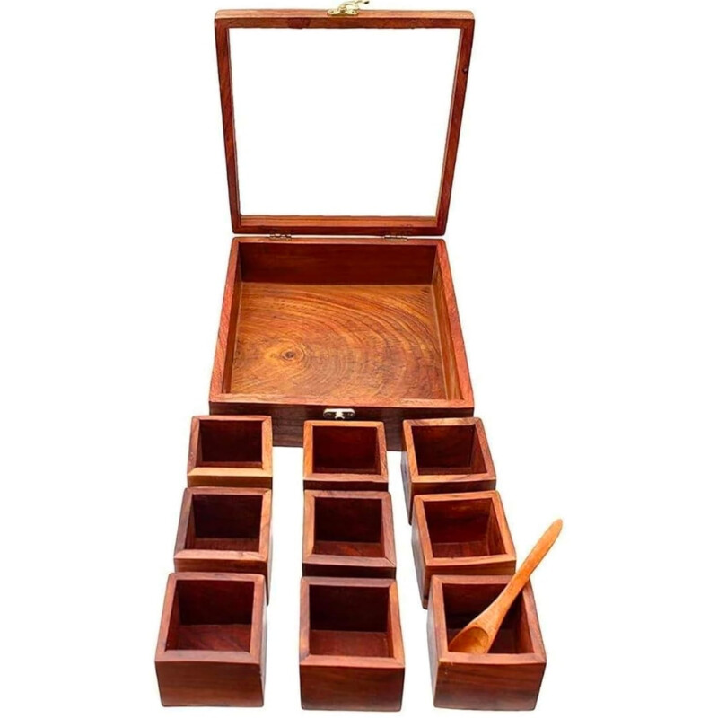 Sheesham Wood Spice Masala Box | 9-compartment Spice Holder | Premium Spice Container