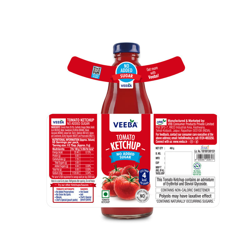 Veeba Tomato Ketchup No Added Sugar|sugar-free Tomato Sauce|no Sugar Ketchup|healthy Ketchup Option|low Sugar Ketchup| Tomato Sauce With No Sugar - 460g