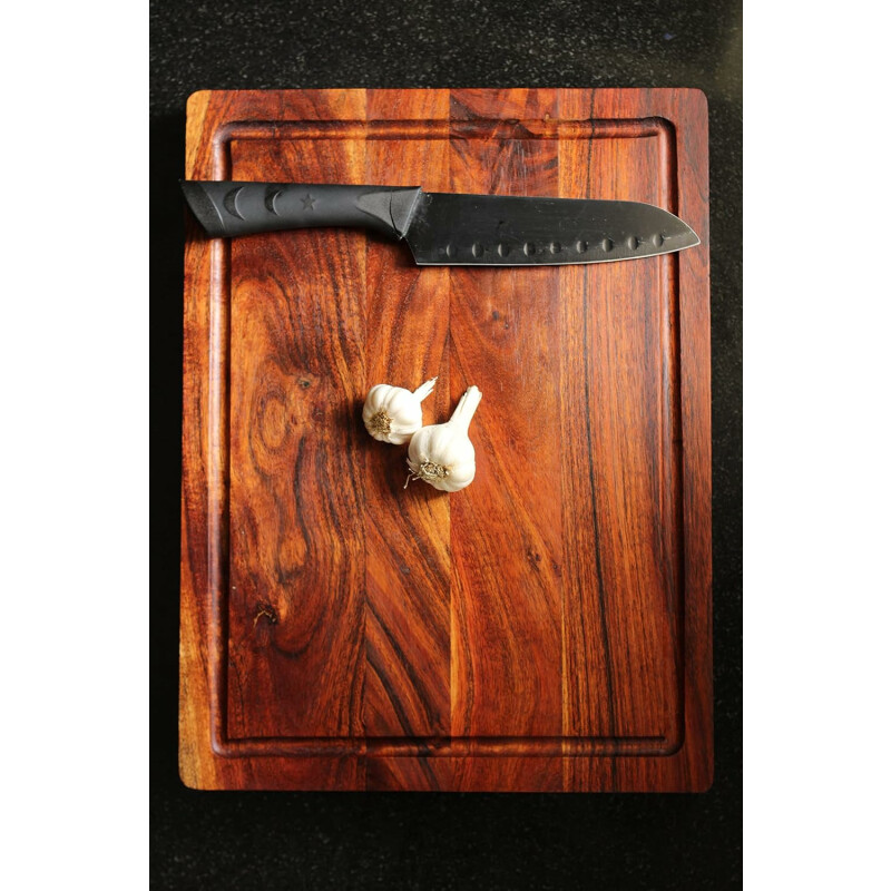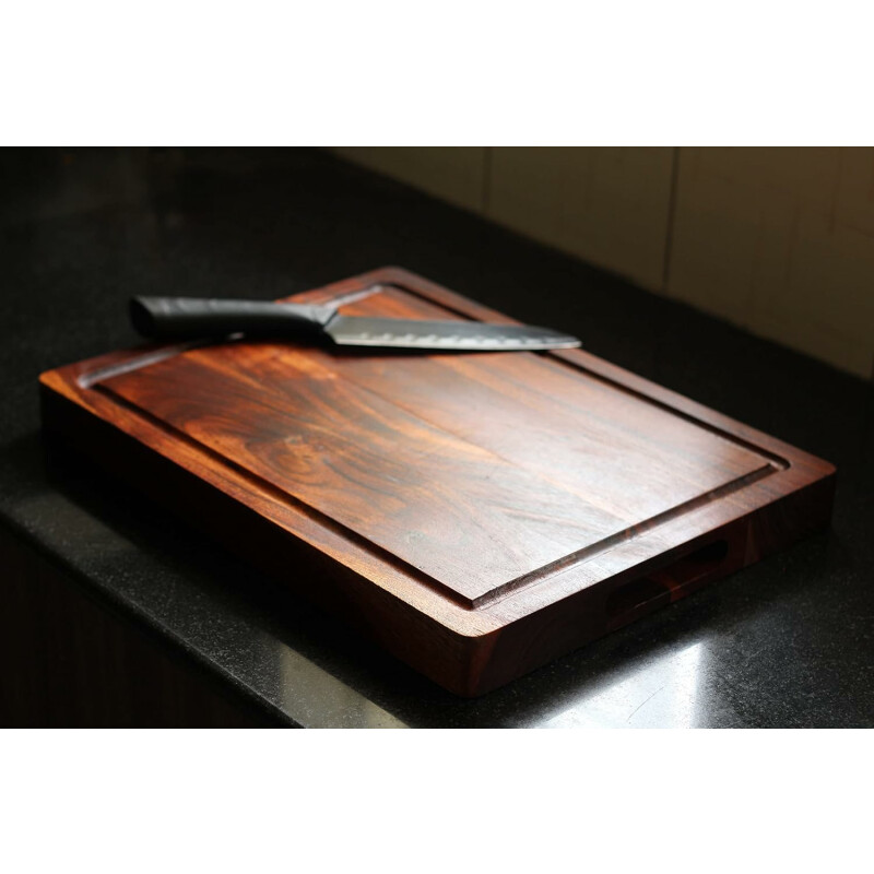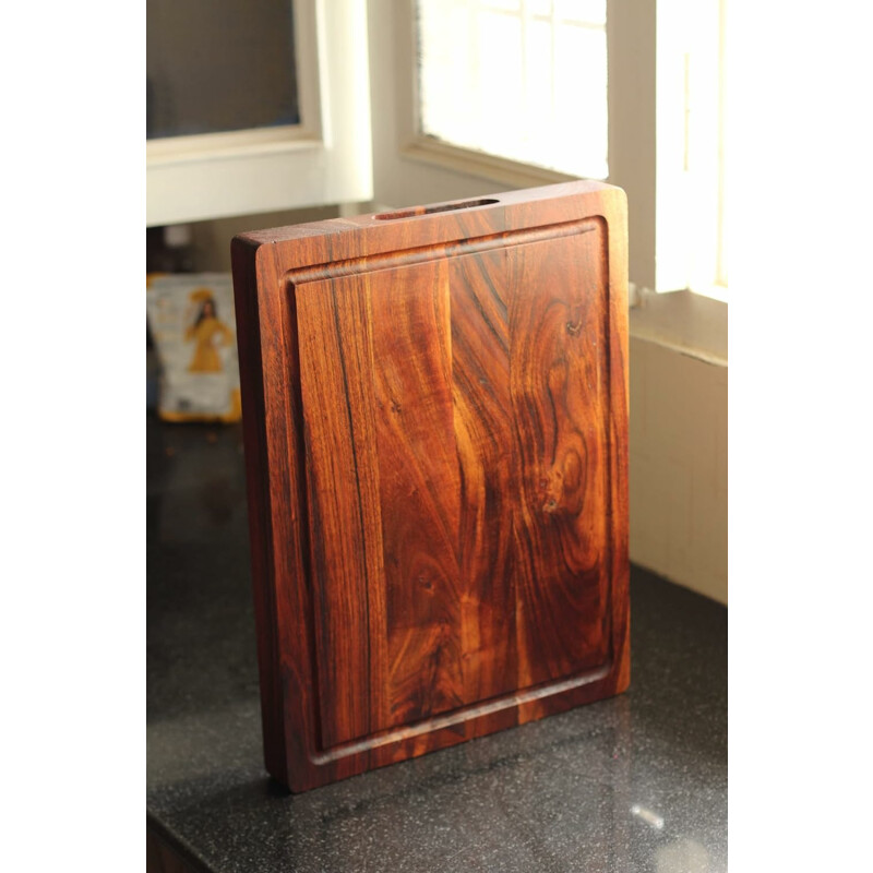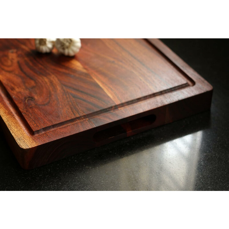 Crafted from premium-grade, well-seasoned Acacia wood, this handcrafted cutting board brings a blend of rustic charm and modern functionality to your kitchen. The rich wood grain, paired with a naturally oiled finish, gives it an elegant aesthetic that enhances any countertop. Measuring 15 x 12 x 1.5 inches, this board is notably thick and sturdy, offering a reliable surface for chopping, slicing, dicing, and prepping.The reversible design allows dual-sided usage, optimizing versatility and longevity.