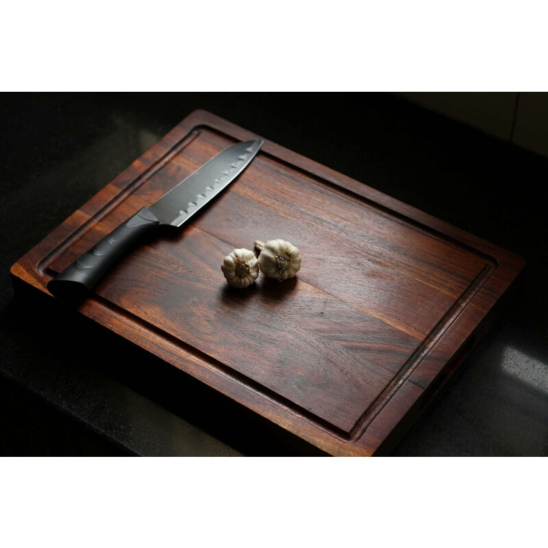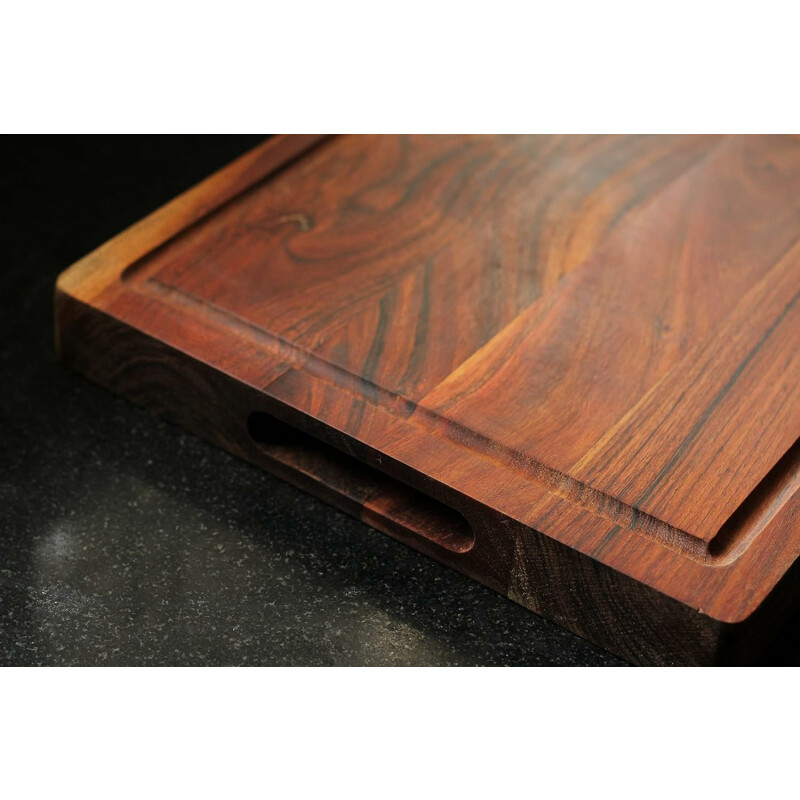 The standout feature is the deep juice groove that neatly captures liquids from fruits, vegetables, and meats, preventing countertop spills and mess. With no varnish or chemicals used, this board retains its natural integrity, making it a safer and healthier choice for food preparation. This robust acacia cutting board features a deep juice groove, ideal for messy prep work, and offers durability and style for every kitchen task.